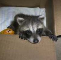 ![]() | Rosie is quite different from our other raccoons. She's short and her coloring is much lighter and more toward brown. She's a hand full already and love to be held. Note that her nose is short and rounded like a puppy's. As she grows older, her nose will become more elongated and pointed. |